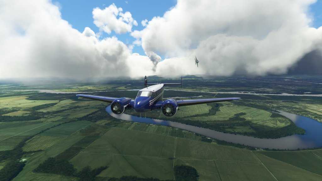 On arriving in the area I dove down through the clouds to setup for a landing at the airport. I regularly fly with multiplayer set to on so I get to see all of the cool and sometimes zany antics of other players and here I had the unique experience of being intercepted and briefly escorted by a F/A-18E.