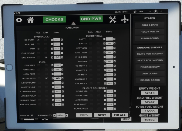 A Failures menu allows you to control over 80 different system and component failures, with options to either fail them instantly or arm them to fail after a specific period of time. There is also a Random Failures mode which will automatically trigger random failures, based on the selected probability (high, low etc).