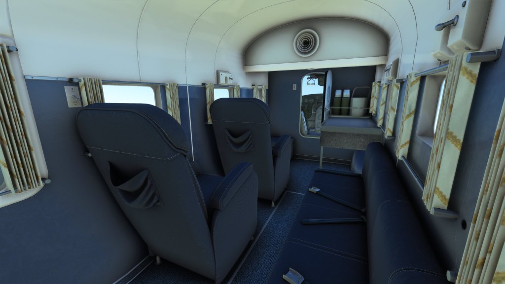 On the inside the story is quite similar with good visuals. The cockpits are similar though not identical and the 40th Anniversary Goose has a luxury passenger compartment with one door accessible and the other one permanently cracked open – enough to see the toilet but not move the camera in there. Big Radials has put more features and more details into theirs with more doors that open and a somewhat more complex cockpit that includes controls behind the pilots which appear to be simpler/different on the free version.