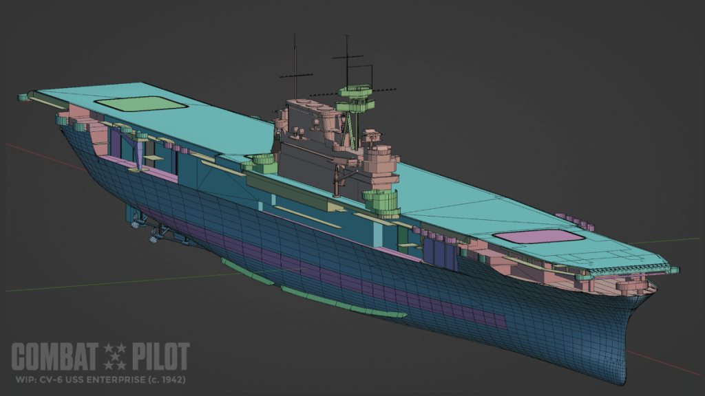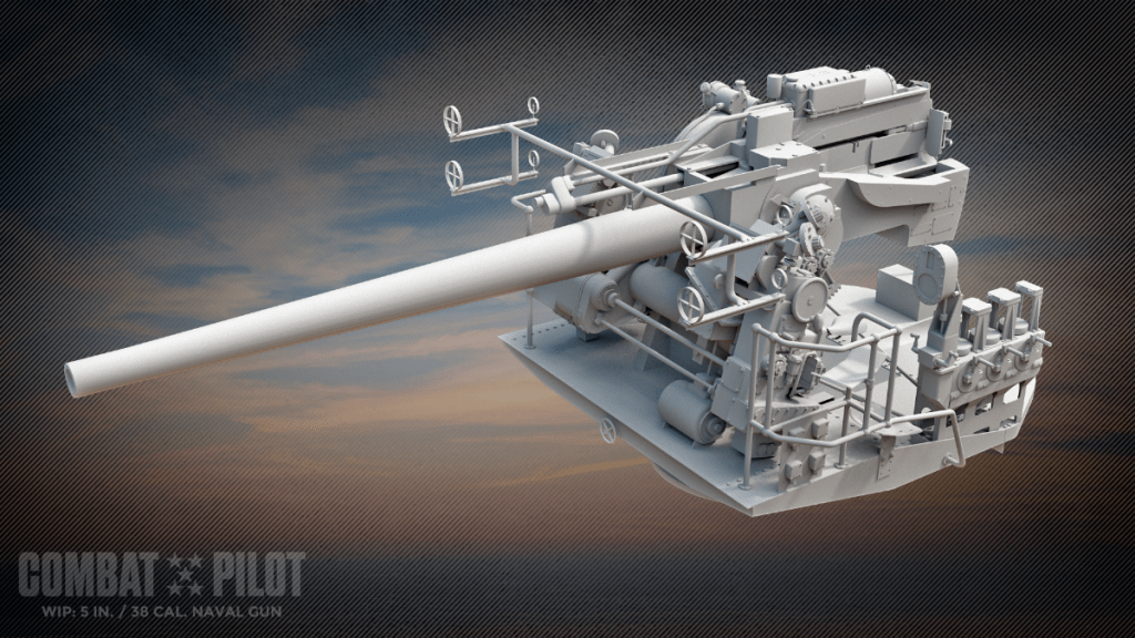 There’s also some development shots of one of the key parts of the Combat Pilot experience – the aircraft carriers. The latest images show us efforts being done to model CV-6 USS Enterprise. Enterprise was one of the three Yorktown class carriers that fought at Midway and being partial to the Enterprise myself I’m pleased to see it in progress! Also in progress is the 5 in. / 38 Cal. Gun for the Enterprise.