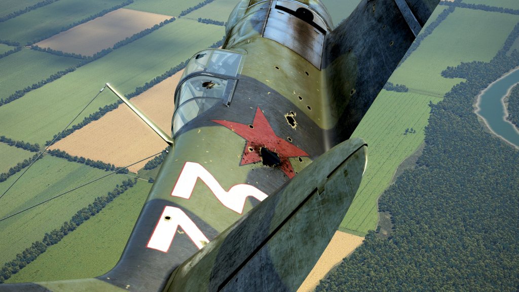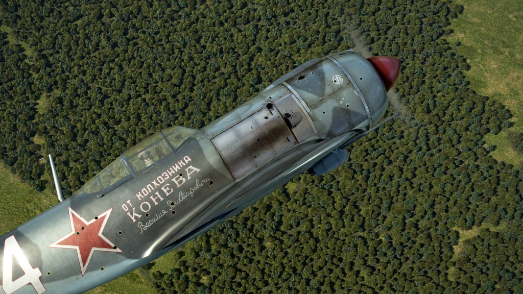 The exterior model of the La-5F is up to the usual standards of the series. Strong texture work, good 3D model work, dynamic damage system support, and tactical code support all combine together to create a cohesive visual.