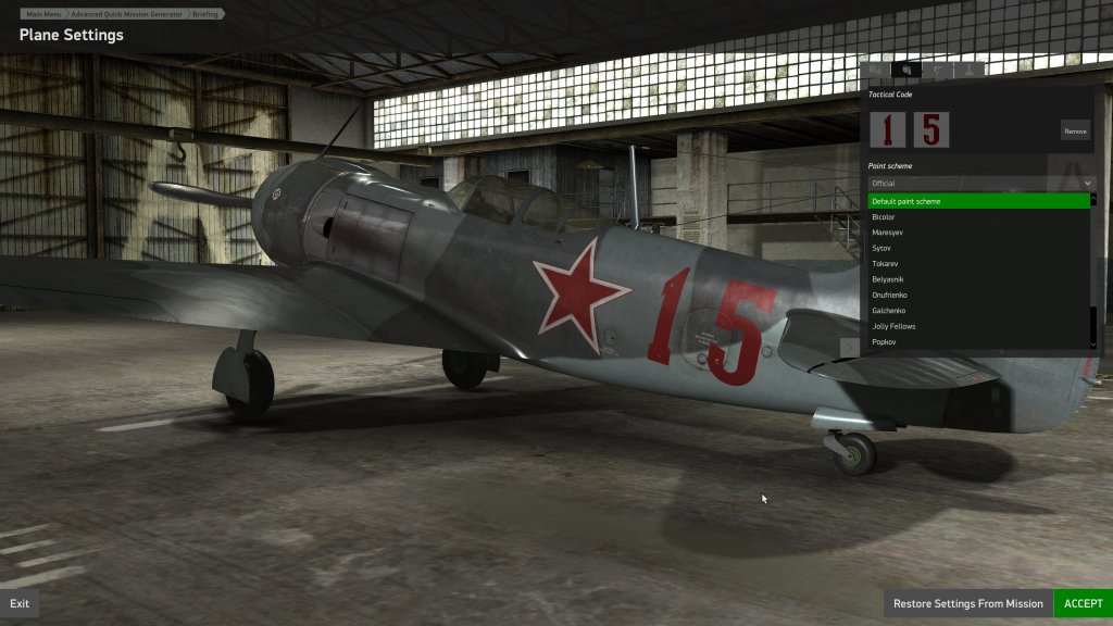 There are twelve liveries included with the aircraft that are unique to the La-5F. There are two generics, a grey and green multi-colour to give you mid 1943 and late 1943 and on schemes (to be used with the tactical code system) and then there are ten more that give you some more unique and famous examples.