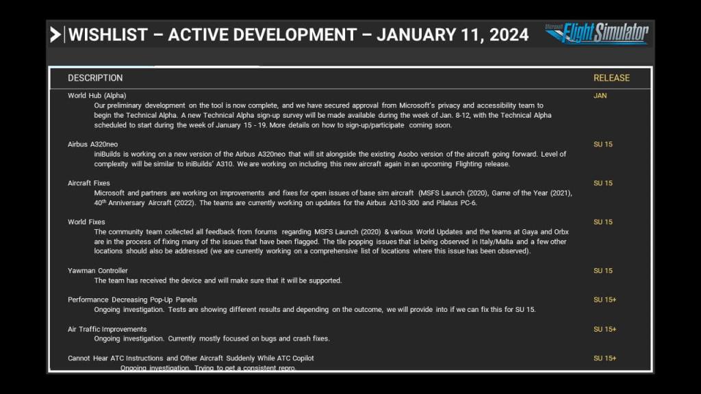 Going back to last week, an active development list gives us some insights into what’s coming up next in Sim Update 15 and beyond. The A320neo V2 from iniBuilds ran into some troubles with poor stability in its testing and so the aircraft was pulled from initial release, however, a new beta testing Flighting will probably include it again as the aircraft is now aimed at a Sim Update 15 release.