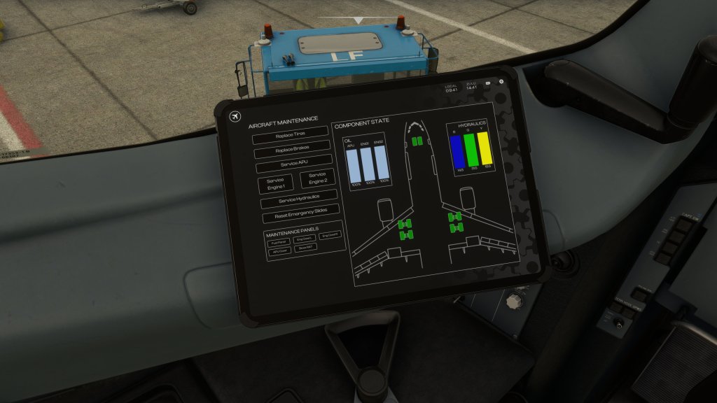Speaking of EFB, iniBuilds have built out the EFB on the A300-600 to do quite a bit more than the standard. The throttle calibration seems better thought out and more user friendly, the included checklist is a great reference, and the interface to control doors, stairs, and other miscellany is really nicely refined. It also has good integration with SimBrief and Navigraph for folks who use those services. Its the maintenance feature, rarely seen on airliners (if at all), that help make this stand out.