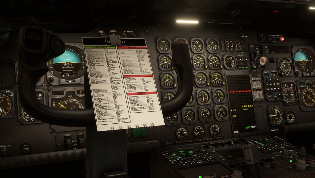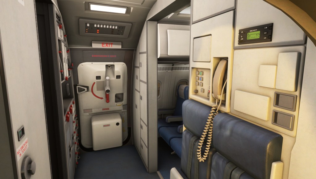 The latest update includes a new custom-coded UNS-1 FMS with support for holds, SIDs, STARs, real time performance calculations and more. There’s also a completely revamped passenger cabin and galleys with crew lighting controls, call light annunciations, a custom music player, passenger and service door and stair controls, and even a galley coffee maker “functions” complete with sound effects. Just Flight have also been busy adding a new interactive yoke-mounted checklist and glareshield clipboard papers. All new in version 2.