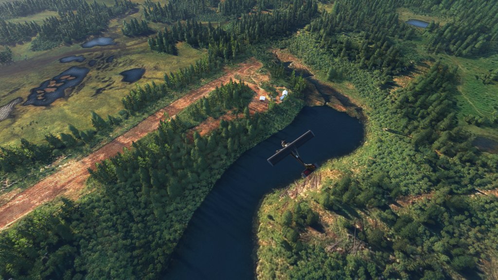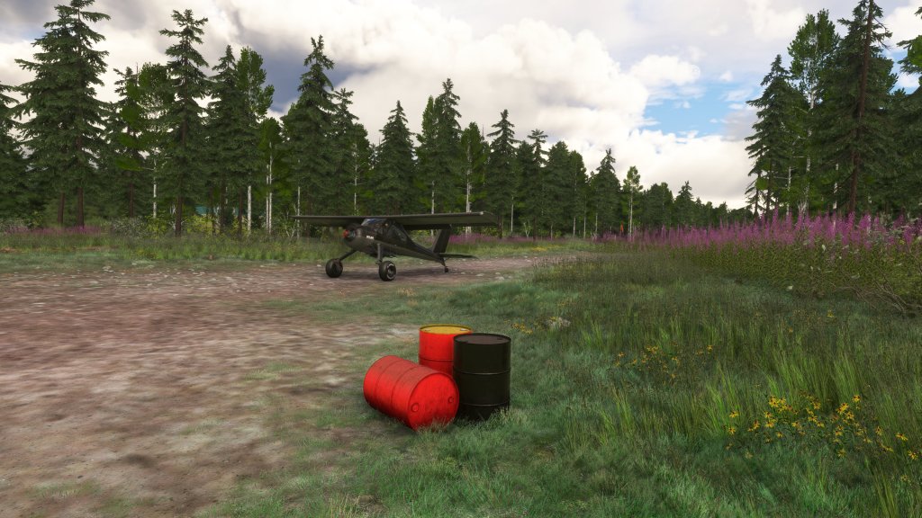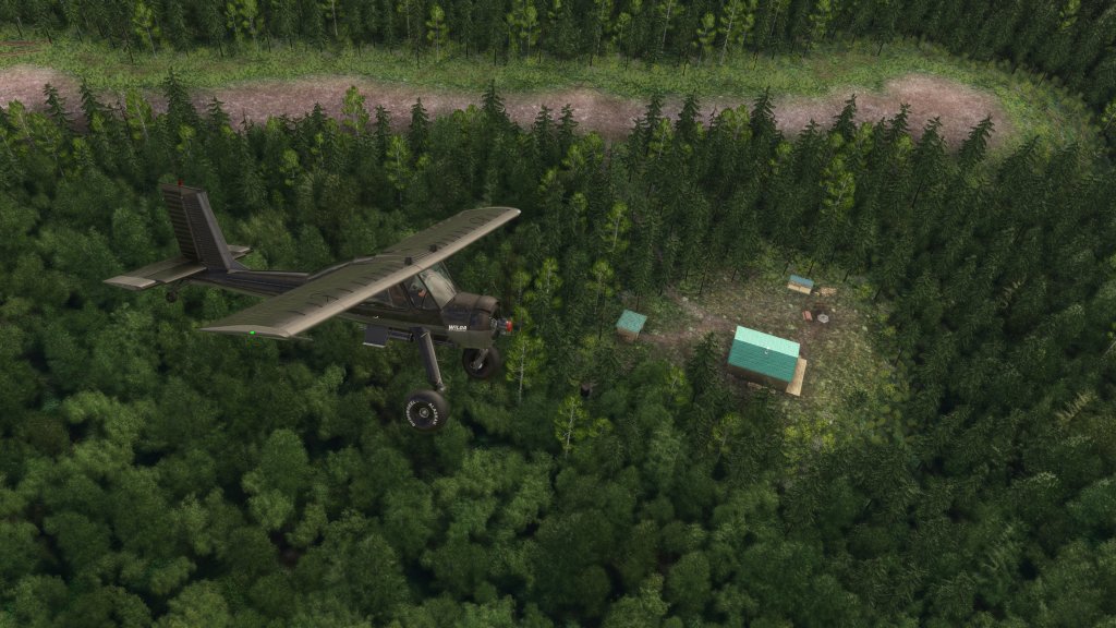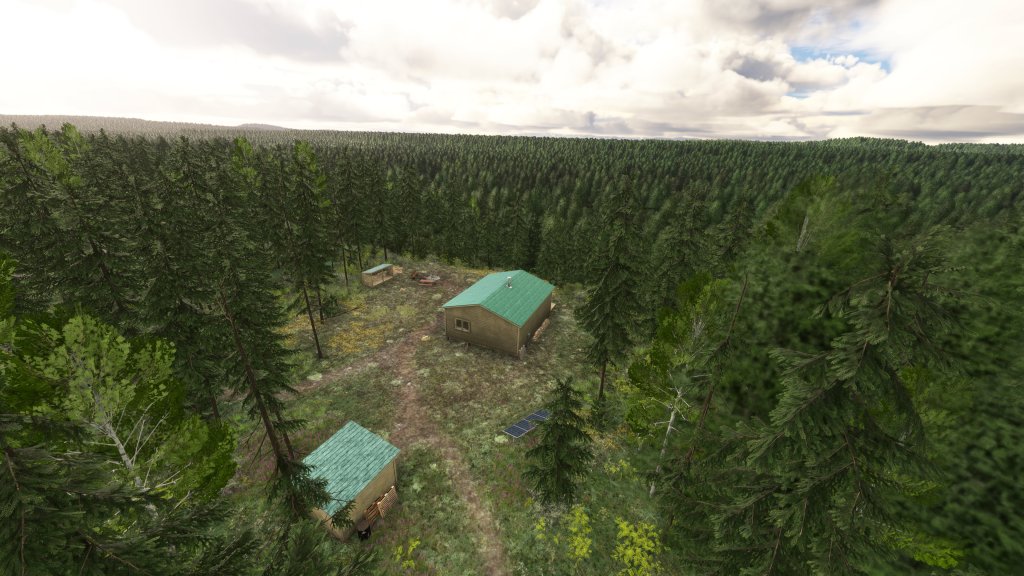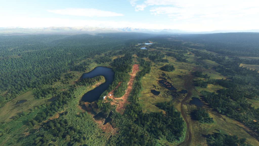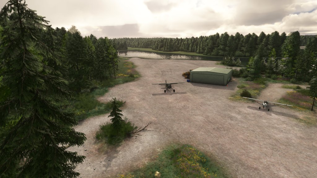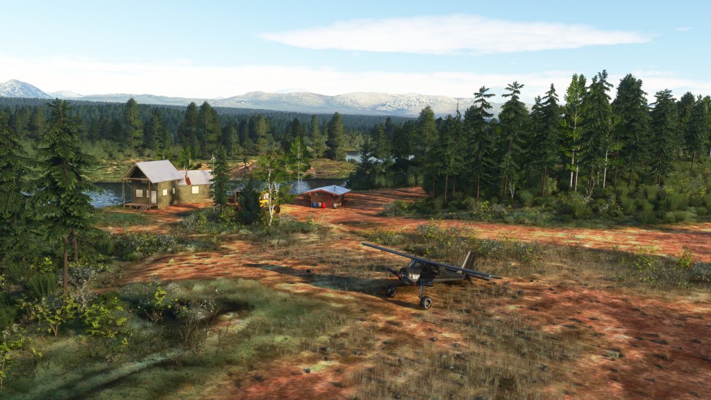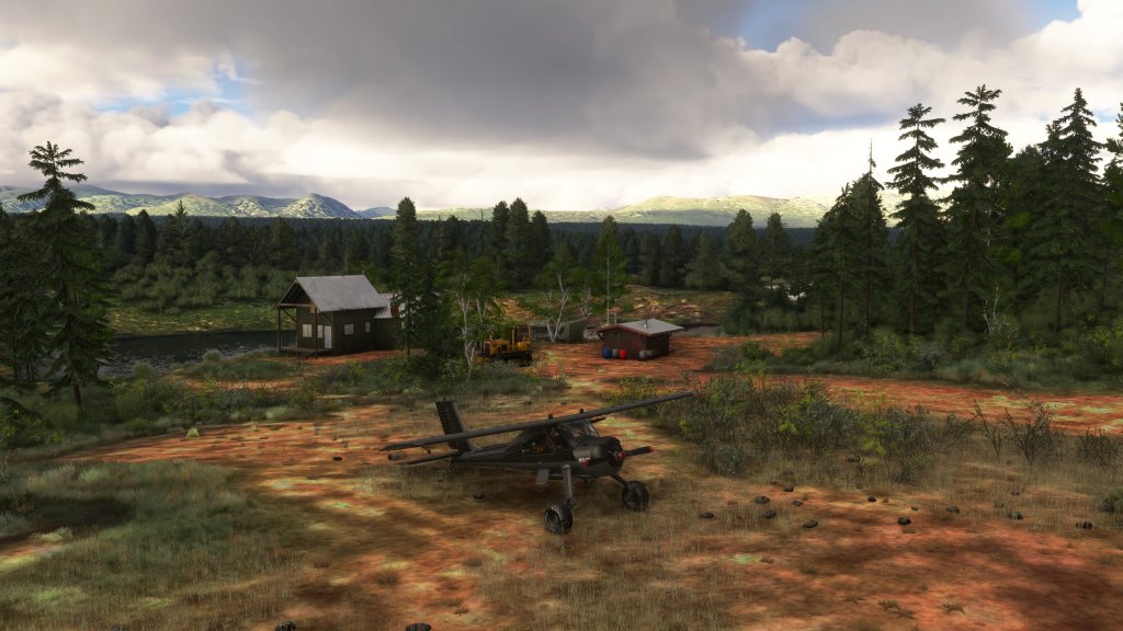 The whole area is just stunning and the extra details that Emerald Scenery Designs did include a cabin and surrounding scenery that includes additional nearby cabins, various out buildings and sheds, a snowmobile, and more. The view is spectacular and there’s a soundset at work here too with birds chirping and other environmental noises. Like there freeware scenery, there are also plenty of plants, trees and even piles of lumber. I can almost smell it!