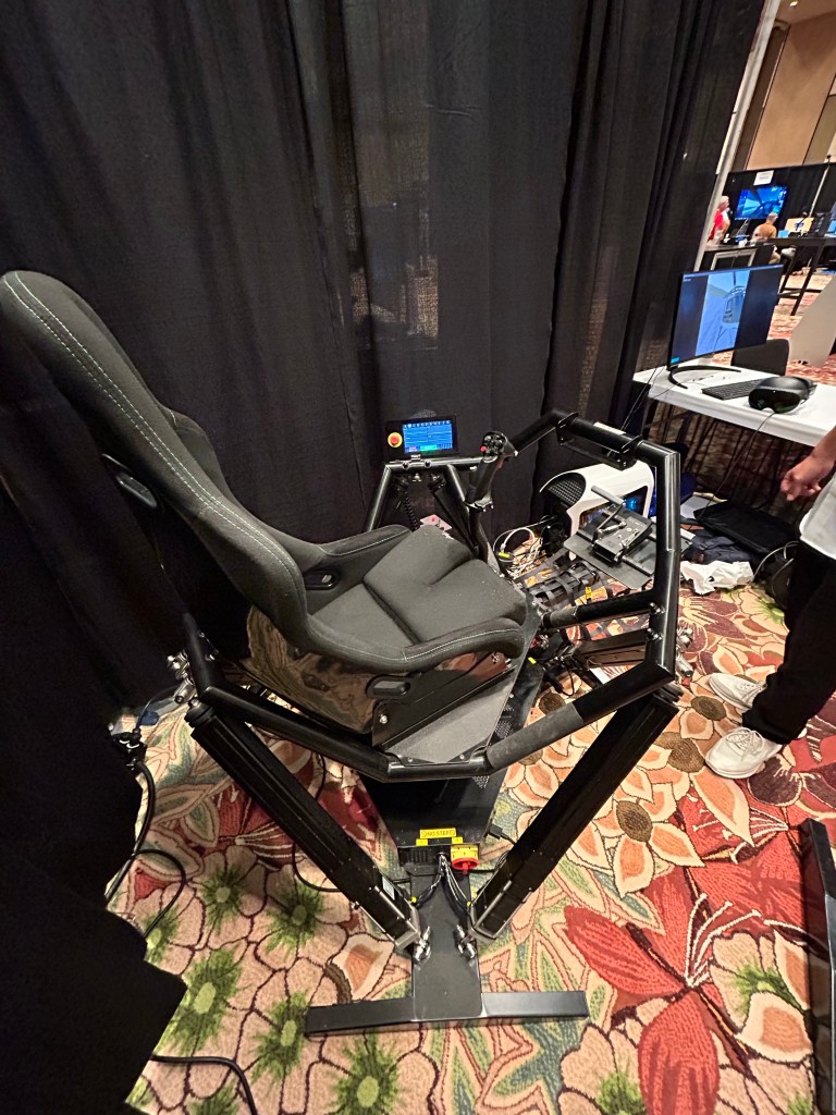 There was so much to see this past weekend that I know I missed a fair bit. I did have a memorable experience I wanted to write about at Hyperionsim’s booth. This was a VR setup with their own powered chair that, when connected to VR goggles, provided for an unbelievably immersive sim experience.