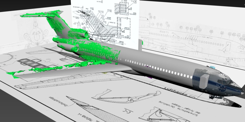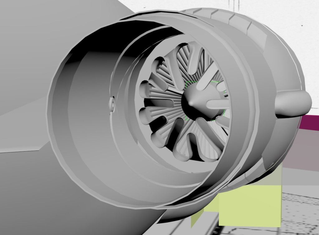 Image show off the 727 model including the engines thrust reverser and hush kit.