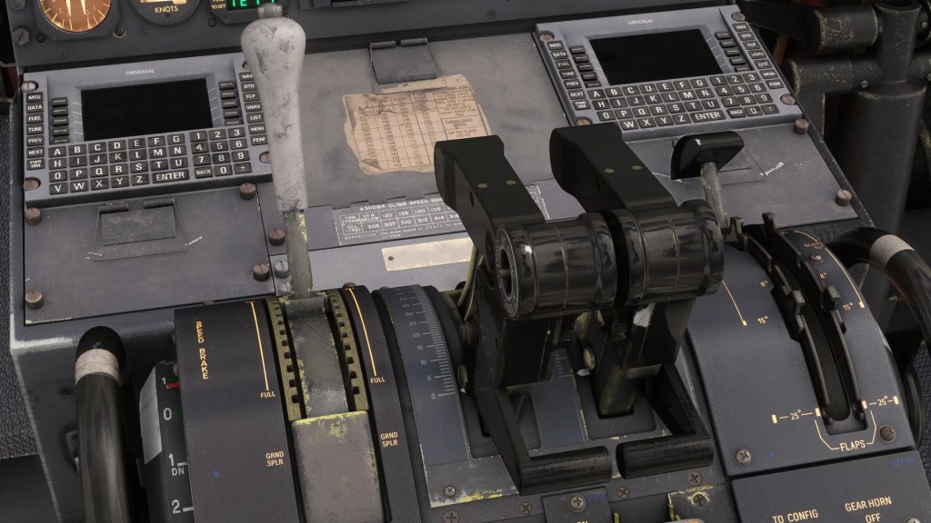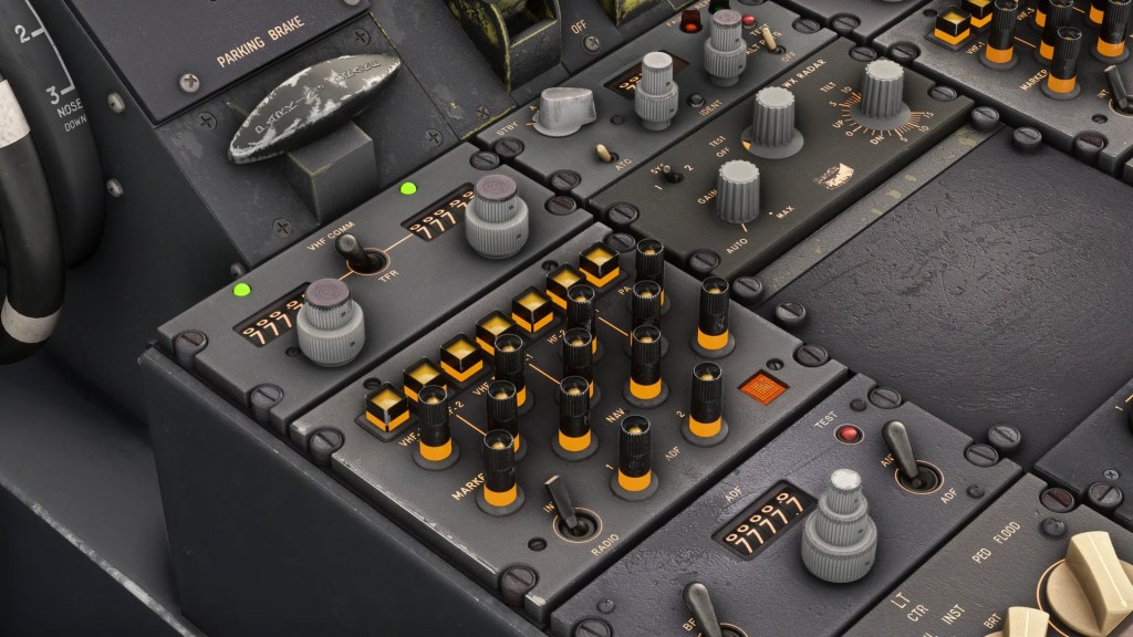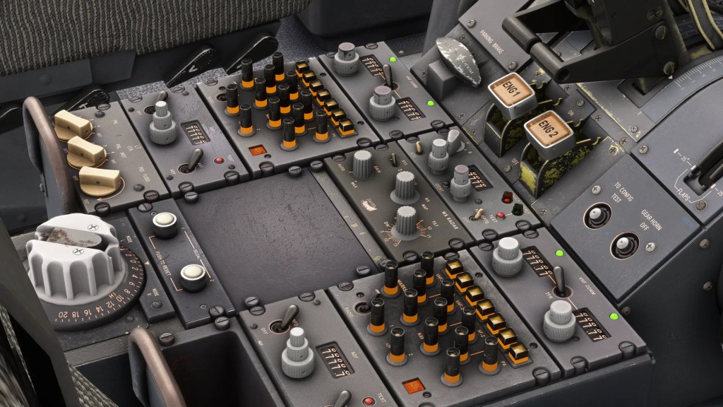 The images above are the first updates we’ve seen on the A300B4 project from Just Flight in just over six months. The new update is focused on the center pedestal with a look at the throttle, radios, UNS-1 FMS, and the Carousel IV Inertial Navigation System’s (INS). The last two in particular are quite different from the more modern version that iniBuilds did.