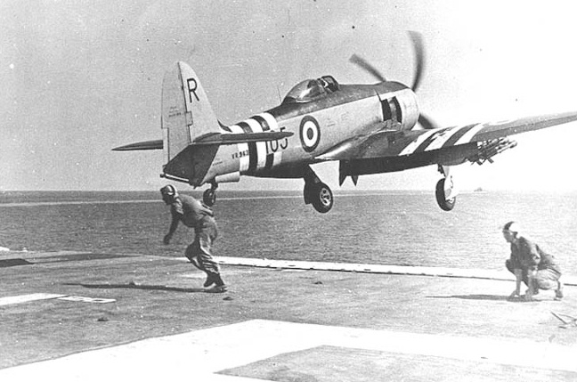 A development of the Typhoon and Tempest, the Fury and Sea Fury were intended to be lightened aircraft with higher performance than their predecessor fighters. With WWII wrapped up and excessive inventory of fighters already on hand, the RAF dropped their interest in the type but the Royal Navy needed a replacement for their not entirely well suited to carrier operations Seafire. The Sea Fury served for several years with the Royal Navy and with some commonwealth countries including Australia. Both Royal Navy and Royal Australian Navy carriers were equipped with the aircraft when they joined the fighting over Korea. The Sea Fury was used for ground attack primarily though it did do battle with MiG-15s and was credited with one of the only piston engine jet kills in the war (though there is some dispute on the account).