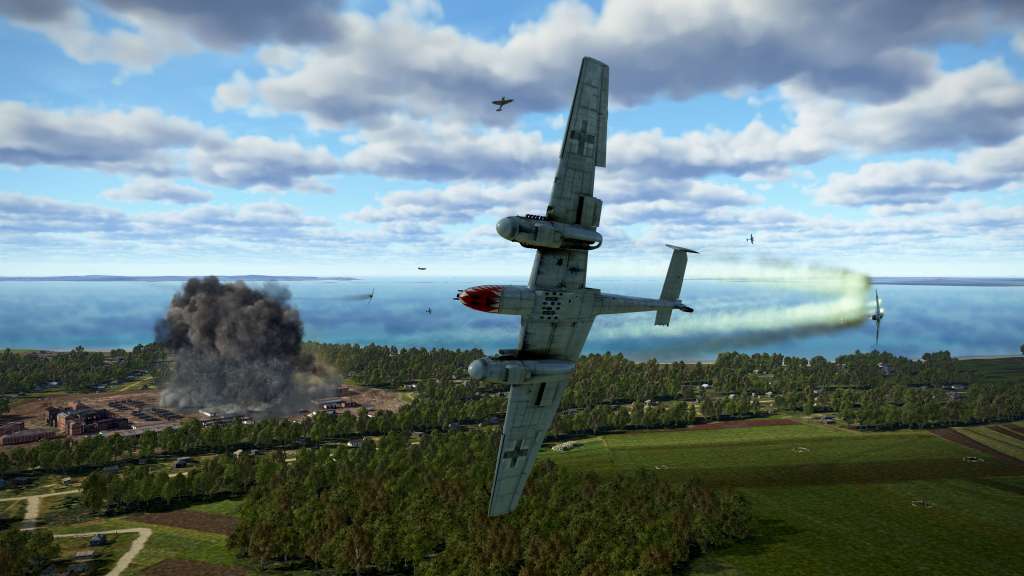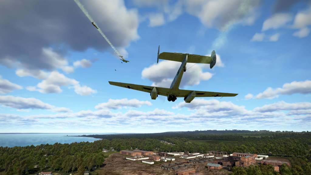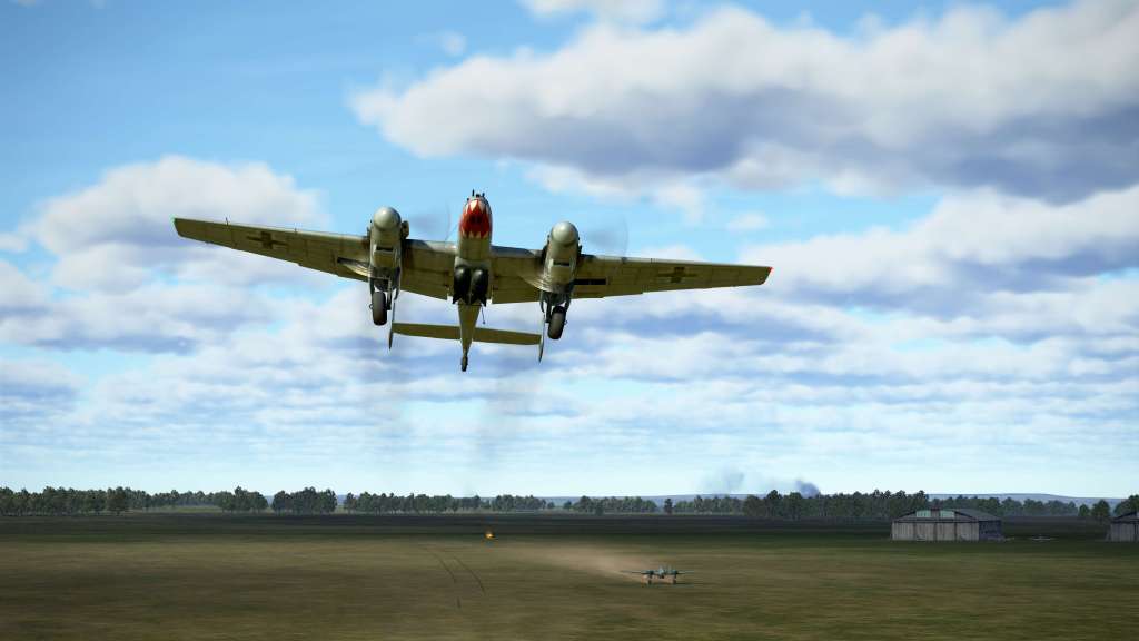 As I turned towards the target again I was hit by a passing Yak who fired a couple of bursts but was shaken off by my defensive turns and rear gunner. Meanwhile, my wingman was laying into the target with guns, destroying more of the target area. Unfortunately, he also drew some attention from a Spitfire that fired on him, taking out a control cable and sending his Bf110 into some nearby trees. Oof!