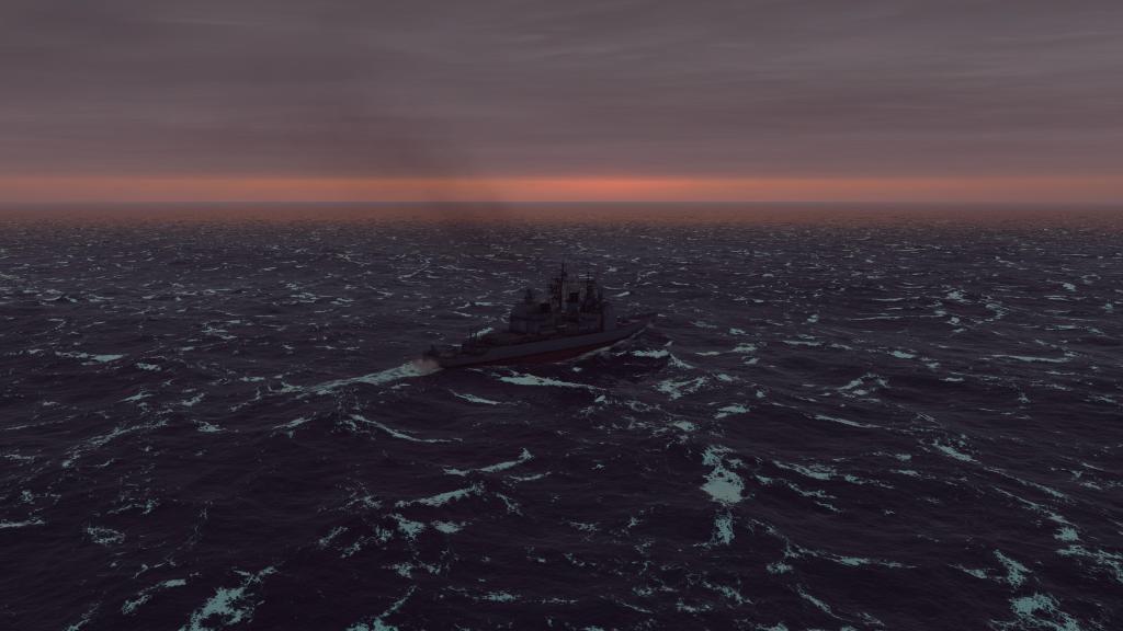 Environmental effects are pretty good too. I haven’t seen any rain showers yet but the sim does have a mix of clouds and clear skies with many scenarios trending towards the moody side. The sun and moon rise and set and visually look stunning. Fire and smoke effects from the ships and missiles are generally good though its clear that they are using older technologies to achieve it.