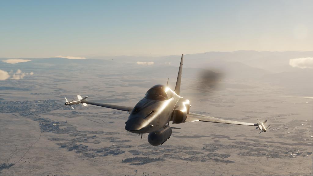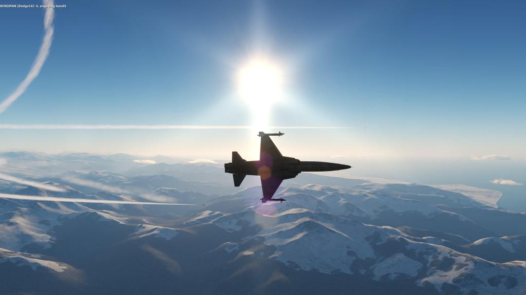 Staying in the mountains and keeping low, the RWR mark for the enemy A-50 AWACS stayed on the scope and I bore in on it while keeping my AI wingmates in tow. Above us I spotted the contrails of the defending fighters. A group of MiG-21s were on the briefing and sure enough that’s what the RWR was telling me as well.