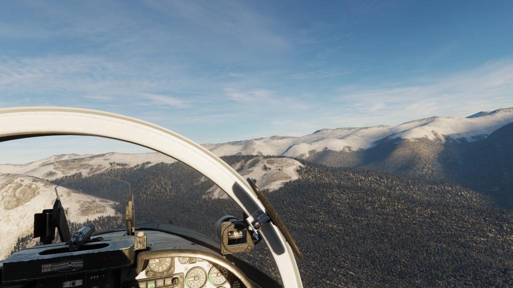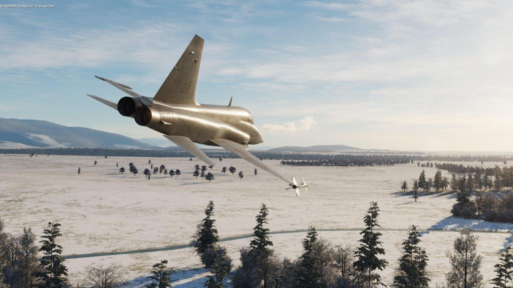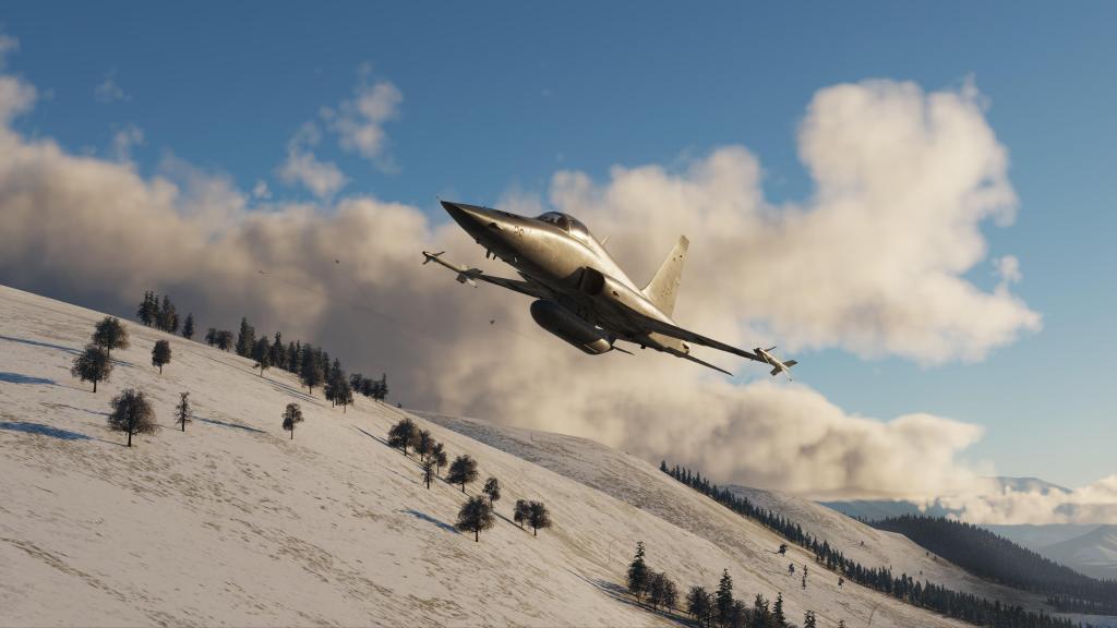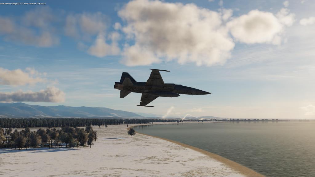 With trees and power lines wizzing past, I was surprised to see that my AI flight were managing to keep up just fine. The RWR lit up with reports of enemy air defenses ahead and I wove a narrow thread between them. At every opportunity I flew my jet along ridgelines, in between clearings, and over the snow covered ground.