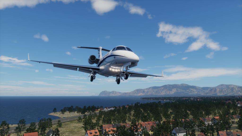 It was one of my better landings in the Phenom 300 too, despite my lengthy stay away. Pilot accounts vary slightly but I’ve read that the real world jet should be flared minimally before aiming for a 2-3 degree nose high angle and then let the jet settle down quickly with the trailing gear absorbing the impact without much trouble. Other techniques can lead to bouncing and ideally you want the jet on the ground. I ended up using the spoilers prior to landing to bleed some speed, though it does have auto spoilers.