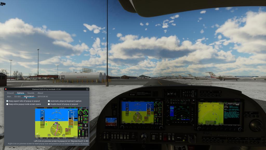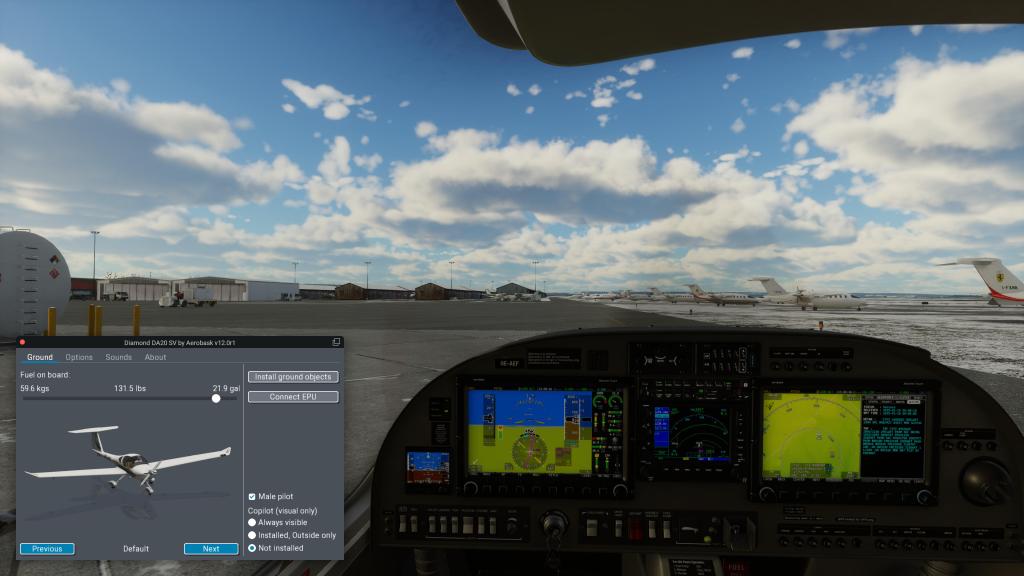 There aren’t too many other extra features but it does come with AviTab support as already mentioned, displayed in the cockpit or hidden away, and it has its own control panel (also displayable in the cockpit or as a pop-out window). The Aerobask control panel lets you adjust the fuel, the livery, swap between male and female pilots, toggle the copilot and visuals of the co pilot, connect the EPU (if the battery has run down), and toggle the external tie downs and covers. There is also persistence features, though not too many complex ones, that track fuel, battery, and panel configuration. An Options screen offers a few extra settings around the avionics panels.