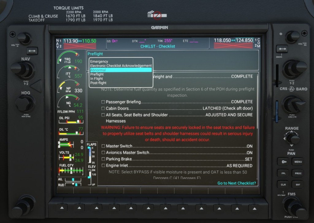 Let’s go by plane and we start with the Kodiak 100. A February 10 release of the aircraft has brought with it some new features with new Engine Indicating System (EIS) with Engine, Fuel and System pages now available for display with correct layout and symbology from the real Kodiak. A full set of integrated checklists are now available on the MFD display.