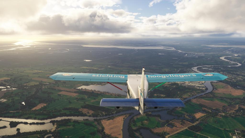 Along the way we were once again treated to the same kinds of idyllic farmers fields, towns, waterways, canals and more. The weather was equally idyllic with puffy clouds. To keep up with VFR rules, I did descend slightly during the cruise to stay under a cloud and in full visibility.