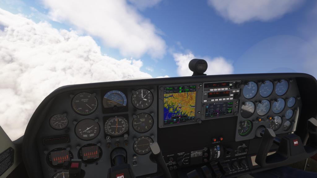 After settling out and playing around with the avionics (you’ll note I swapped the default GNS530 for the PMS50 GTN750 during this stage) and my flight route, I reached a cruise climb of 11,000 feet and kept on into the journey.