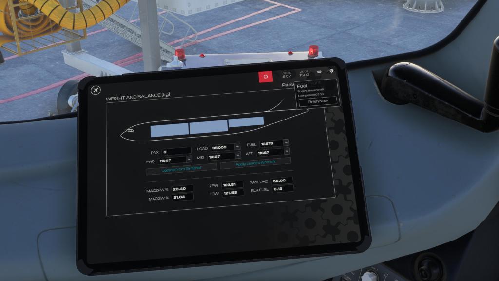 The EFB gives you the ability to do a panel state change setting the aircraft in various configurations including cold and dark, turn-around and ready for takeoff. A brief time period where the aircraft systems come online lets you get set for flight. SimBrief support in the ACARS menu allows for a quick import of the flight plan too.