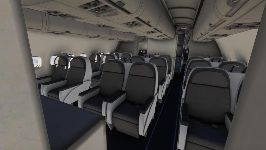 The passenger version has a pretty standard cabin area with solid detailing all around. There isn’t any interactivity back here but I don’t really mind that. There’s a two class setup with dividers, multiple seat types, and galley modeled.