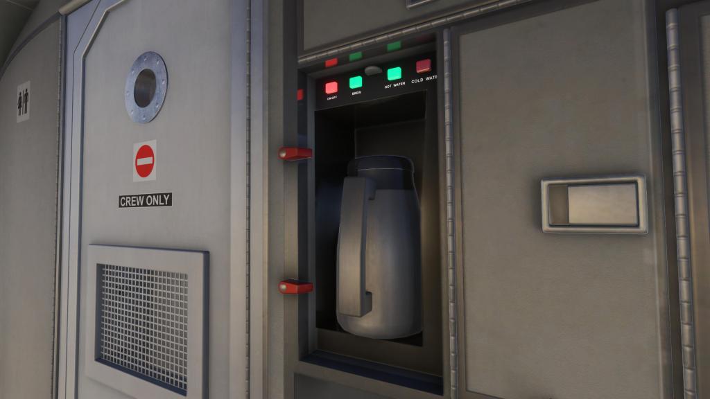 The cabin is quite well done. I tend not to spend much time back there in these simulated airliners but it is a checklist feature for most products these days and the cabin is a nice immersion layer. There is some interactivity back here too with adjustable lights, a music player, and a “working” coffee maker with sounds and lights that add a little extra to the ambience back here. The most recent update, version 1.4, have also added options for branding the interior cabin which are a welcome touch.