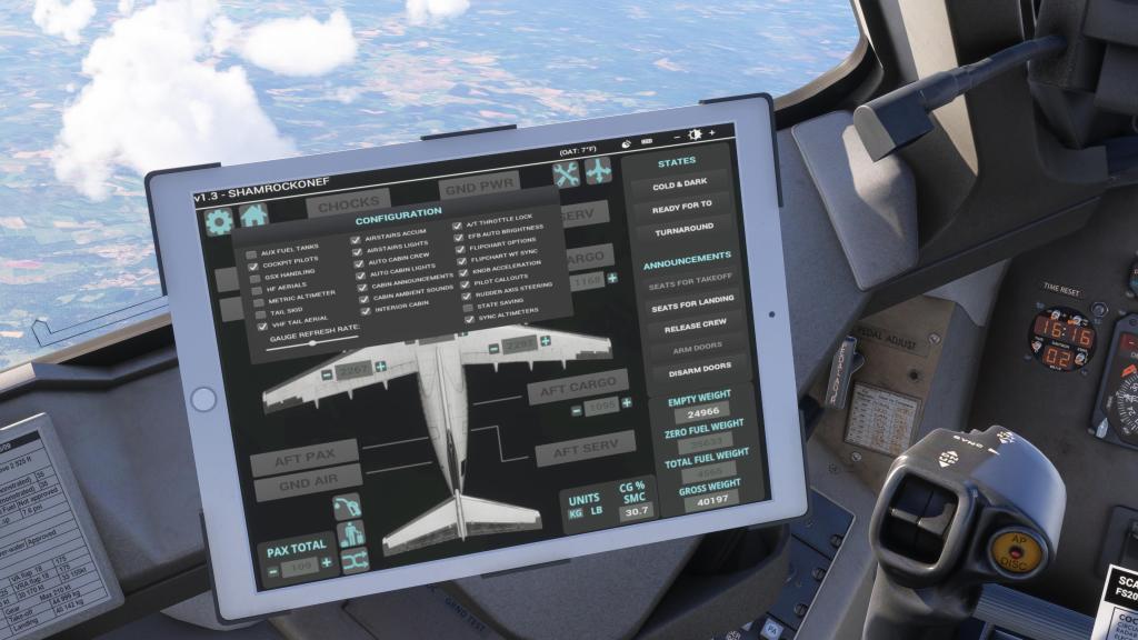 Just Flight have fitted the Avro RJ with the latest version of their airliner tablet. This is a now familiar configuration with access to various aircraft options, configuration settings, and the ability to set different aircraft states. This is also where you manage passenger count and fuel settings.