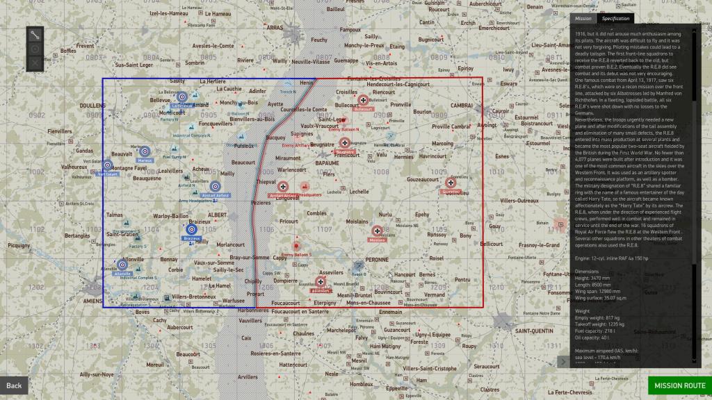 My aircraft of choice for this sortie was the Airco DH4. A two seat British bi-plane day bomber with the ability to sling an impressive loadout for an aircraft of the era. I picked two larger HERL bombs and eight smaller bombs. This plus the aircraft’s forward Vickers machine gun and rear facing twin Vickers fitted turret makes for a prickly airplane.