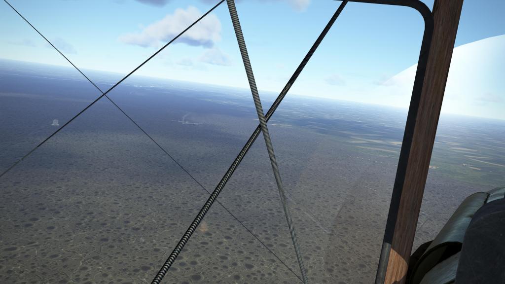 With the engine cranked and started, my gunner and I set off for our artillery strike mission. Gradually climbing, the DH4 felt steady and able to take the task on. We climbed over no-man’s land with artillery shells splashing on the ground all around us… a reminder of the brutal nature of WWI trench warfare.