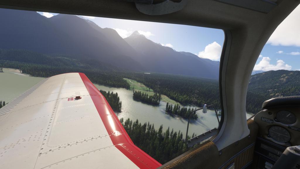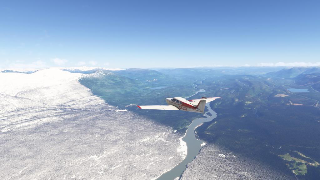 As you can see from the screenshots, this flight took place on another clear day with blue skies throughout the journey. Cruising along the Kitsumkalum River for the first part of the journey, we got into some interesting conditions on the ground where the sim was showing snow. This is because the resolution of the snowpack is lower than ideal and so snow on the mountain gets shown as snow in the valley.