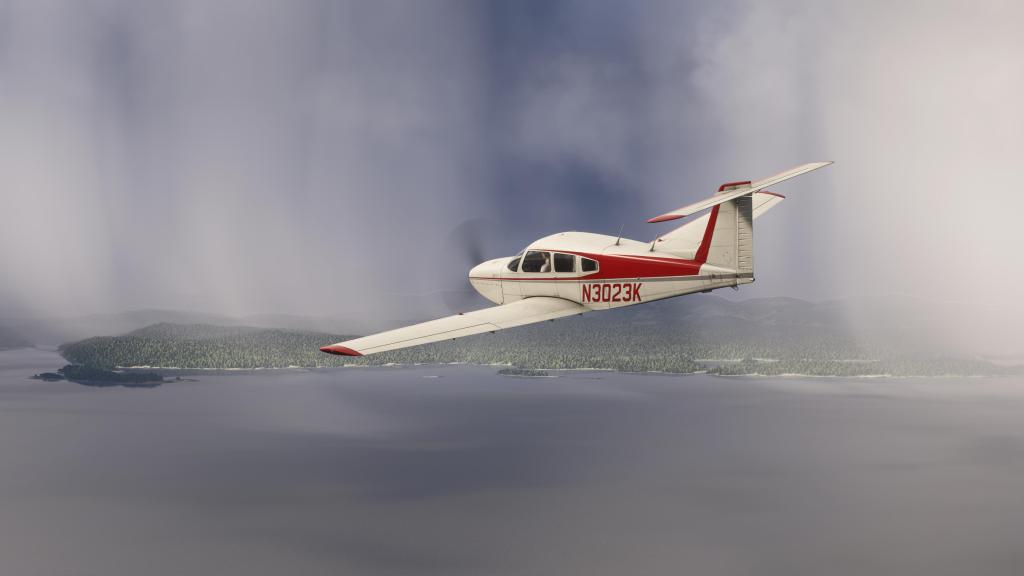 Departing Port Hardy on this leg of the journey was easy and smooth but the weather ahead was anything but. Heavy rain and low cloud deck made safe VFR flying difficult to impossible. I suspect real world rules would have prevented this flight from even occurring but in this counts as adventure in a flight sim like this so I pressed on, dodging rain storms as best I could.