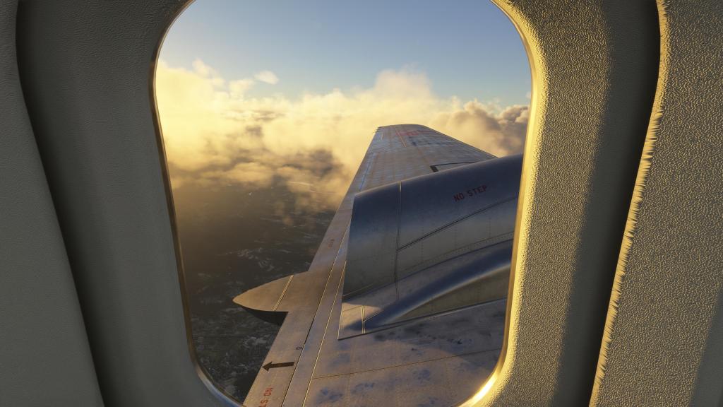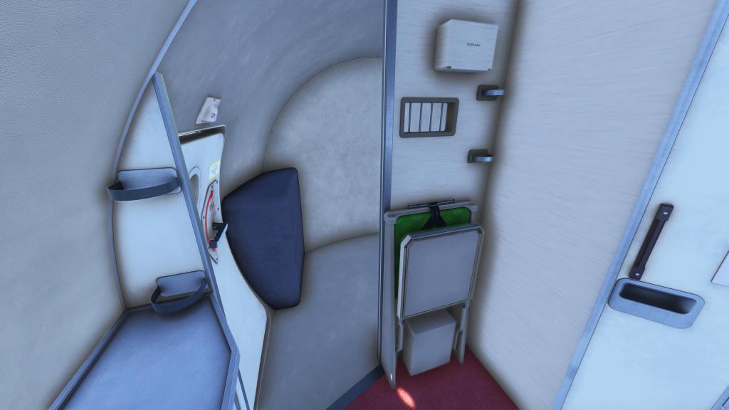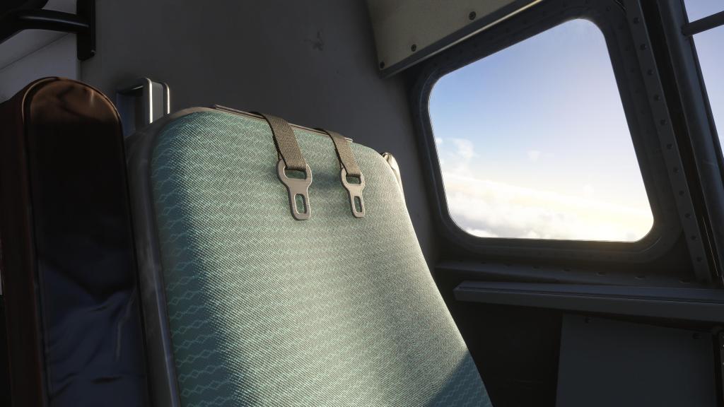 The interior is good too though maybe not quite as convincing as the outside. The texture quality is sharp, there’s sufficient scratching and wear and tear to make you believe this is a classic airliner, but I don’t think any light baking effort was put in as the global illumination of the aircraft makes it look just a little flat at times. The cabin is fully featured with the ability to see the passengers, the window shades are interactive as is the toilet (which you can click on and it plays a flushing sound… ha!). The quality is overall is good and for the price point its more than adequate.