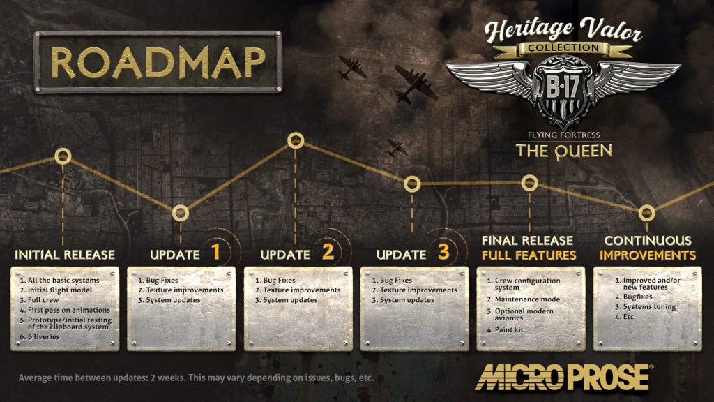 MicroProse have laid out a roadmap for how the release of the B-17G is going to go. We’re at the initial release stage right now with basics systems, flight model, crew, animations and a prototype of the clipboard system to control the aircraft.