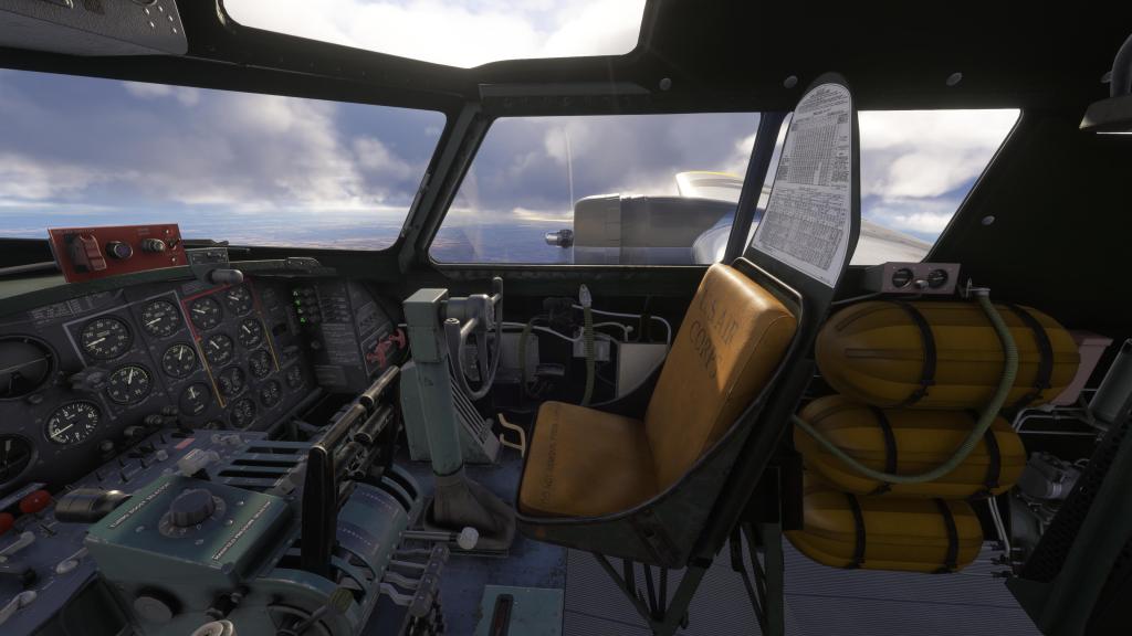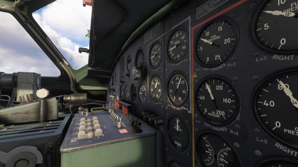 The exterior model is really impressive with lots of details and sharp textures and the flight model, work in progress as it may be, already provides a fair bit of character to the aircraft. Hard over on the stick and the aircraft will very gently begin to roll. It’s what you expect from a large winged aircraft of this era with unpowered ailerons. It feels right! The animation work is smooth, the cockpit generally looks great, and the rest of the aircraft is modeled and present for you to go and explore.