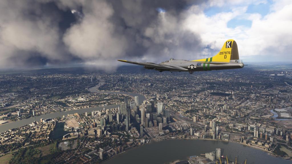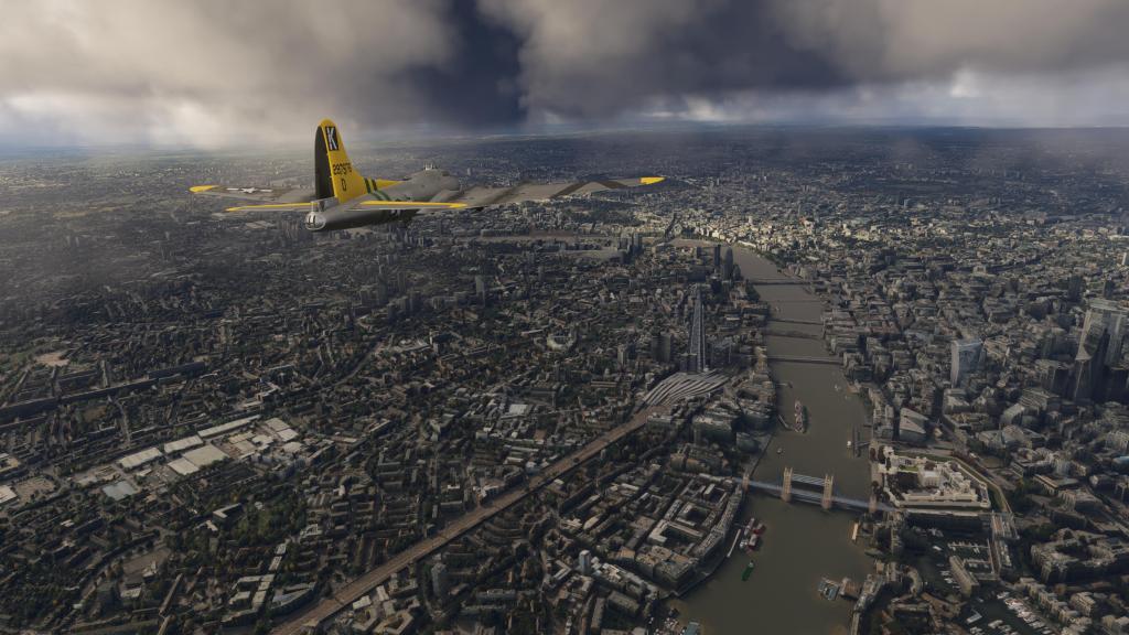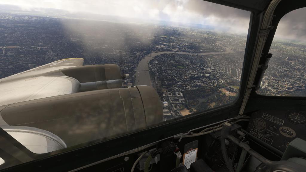 After messing around in the immediate Duxford area, I climbed a little and headed south towards London. I stayed mostly VFR on this flight staying out of the thick clouds and under the cloud deck. Rain storms to the west and the general autumn skies really helped set a fantastic mood as I cruised towards London. I haven’t discovered the autopilot system just yet but trimming the B-17 out leads to relatively stable flight.