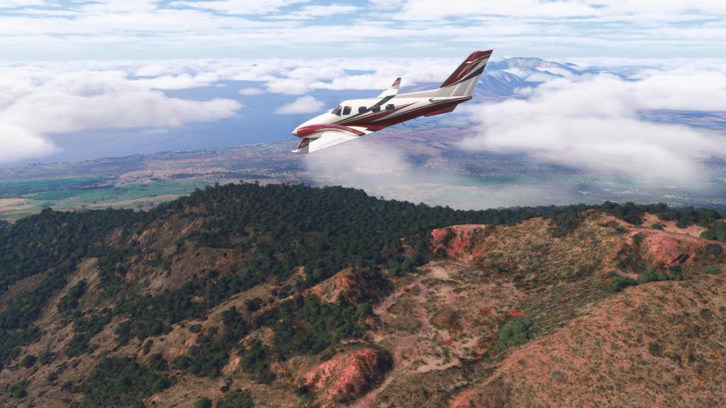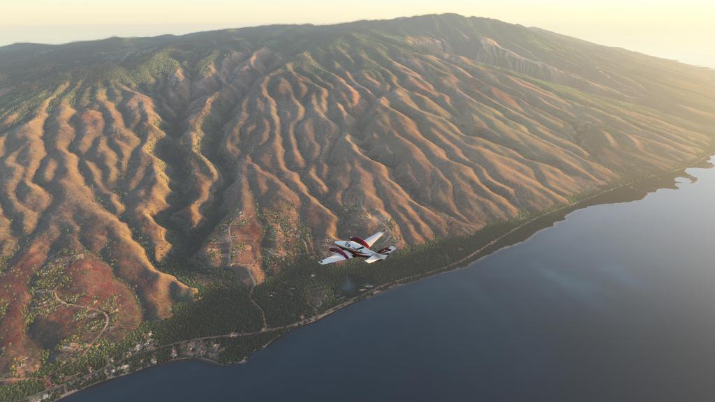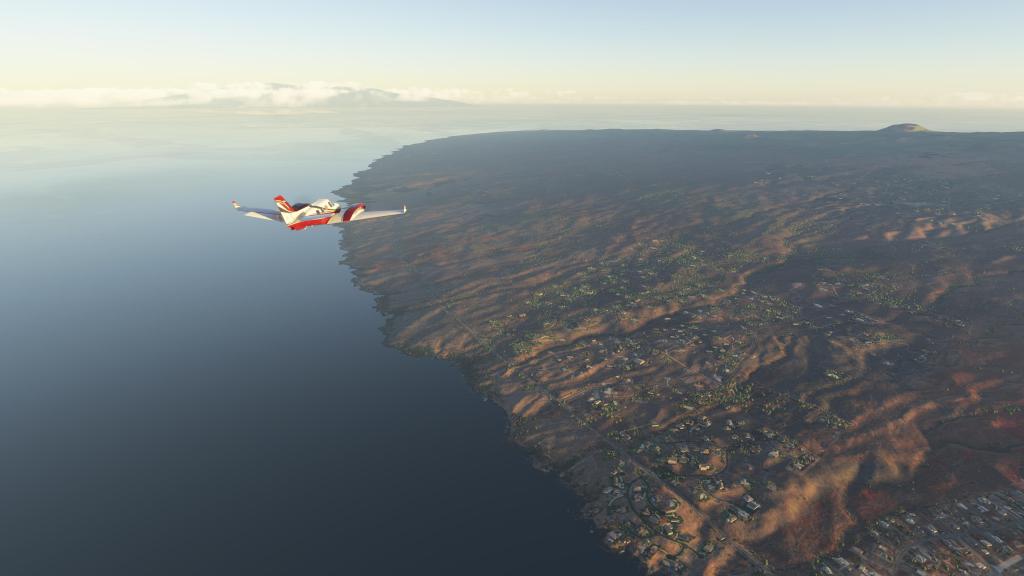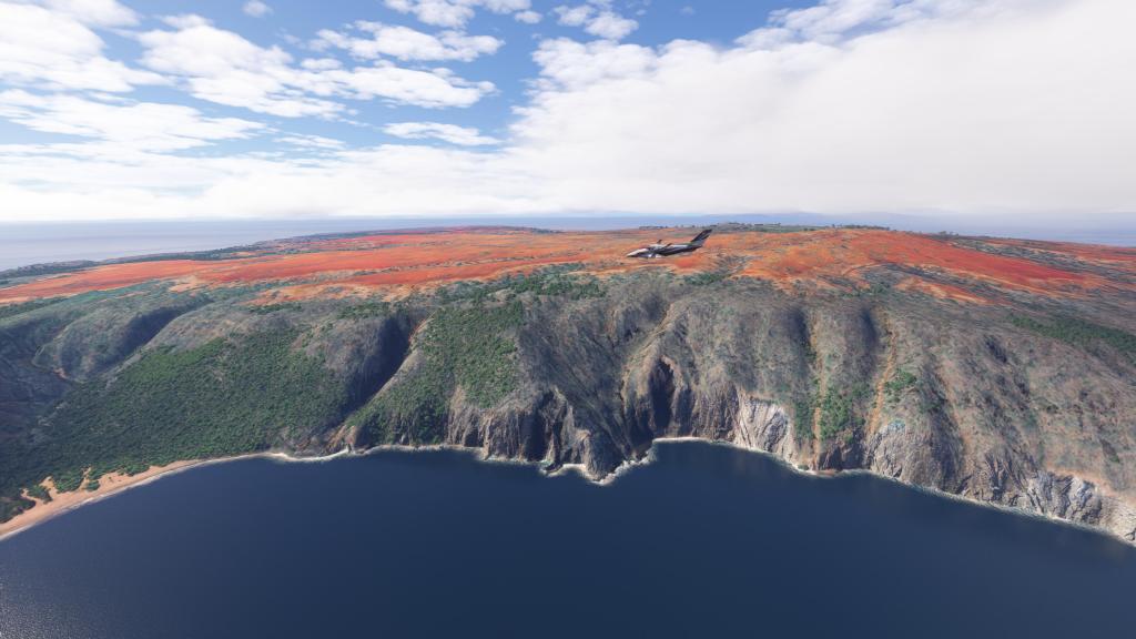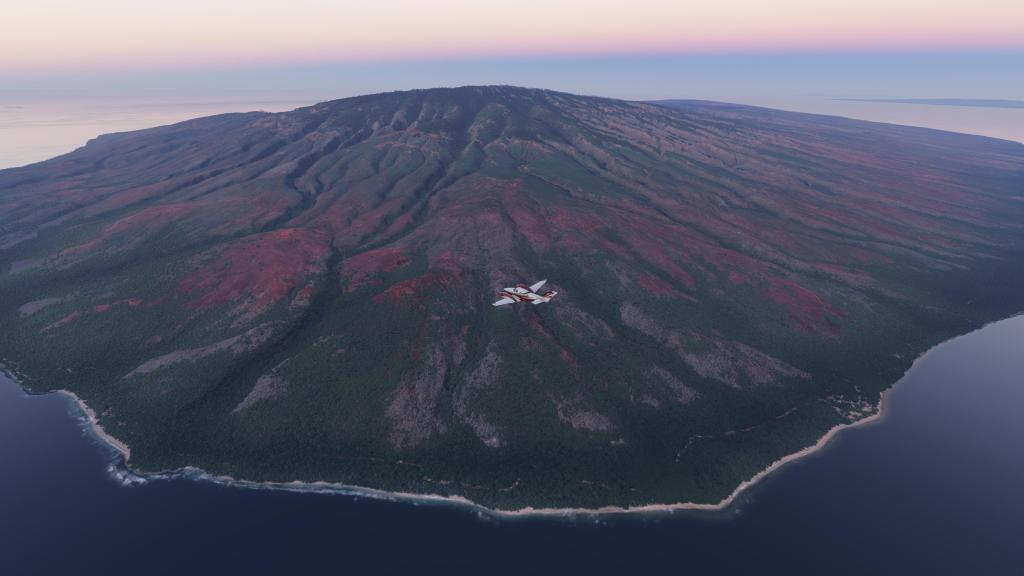 After taking in the sights, I descended down the other side of the mountain and did an overflight of Kaho‘olawe. This island preserve is a cultural and archaeological site and it has some incredibly red soils and rocks. MSFS isn’t overplaying the redness as photos of the island reveal.