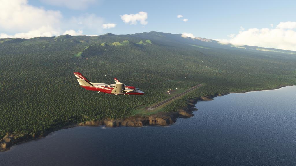 This is a very cool airstrip carved out of the forest and with scenic views of the mountains in one direction and the ocean in the other. The apron is just the right size for an airplane like the Duke to come on in for a landing.