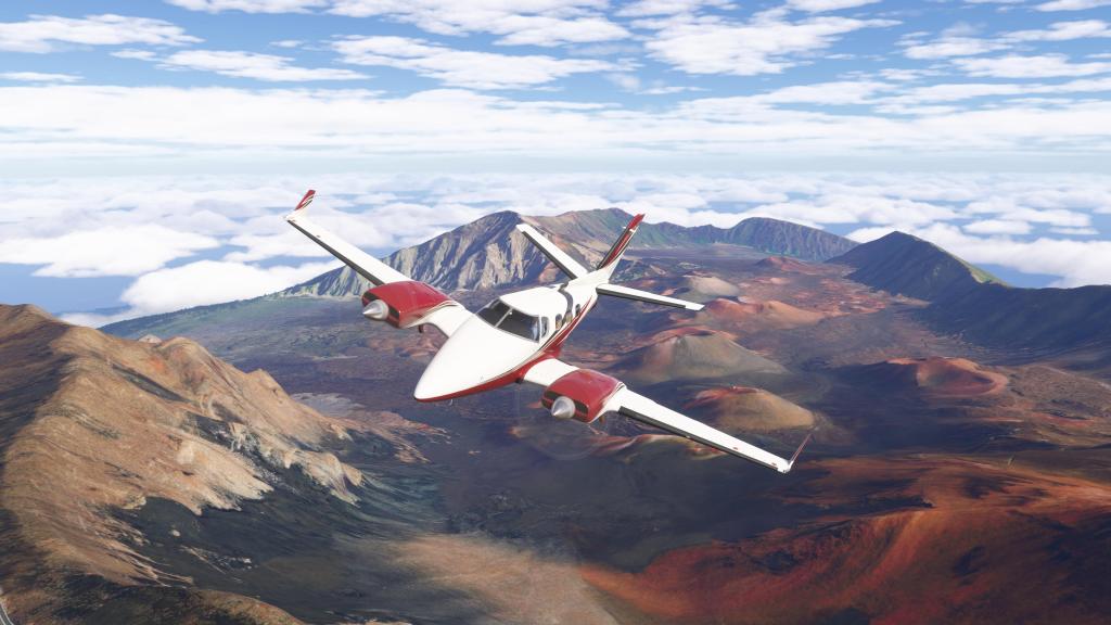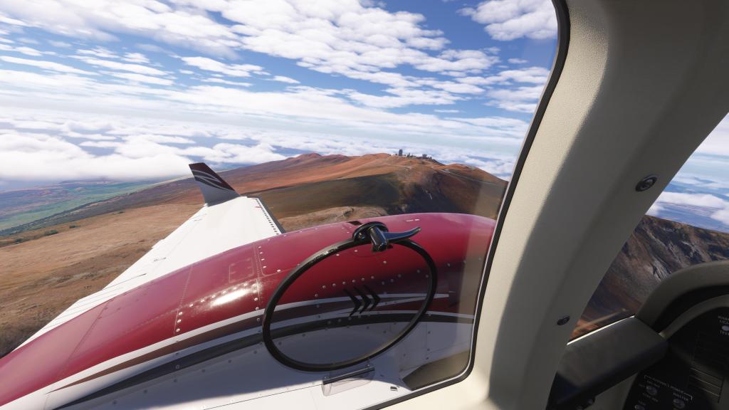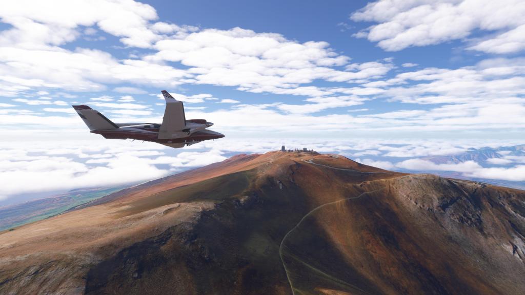 This next flight really helped me get a sense of the sale of the Hawaiian islands. Departing Hana and heading south west across the island, I climbed my Duke up to 11,000 feet so I could get a look at the top of the mountain and Haleakalā Observatory (a MSFS point of interest). The observatory is, itself, at 10,100 feet clearing away much of the haze from thicker lower altitudes making it an ideal observatory location.