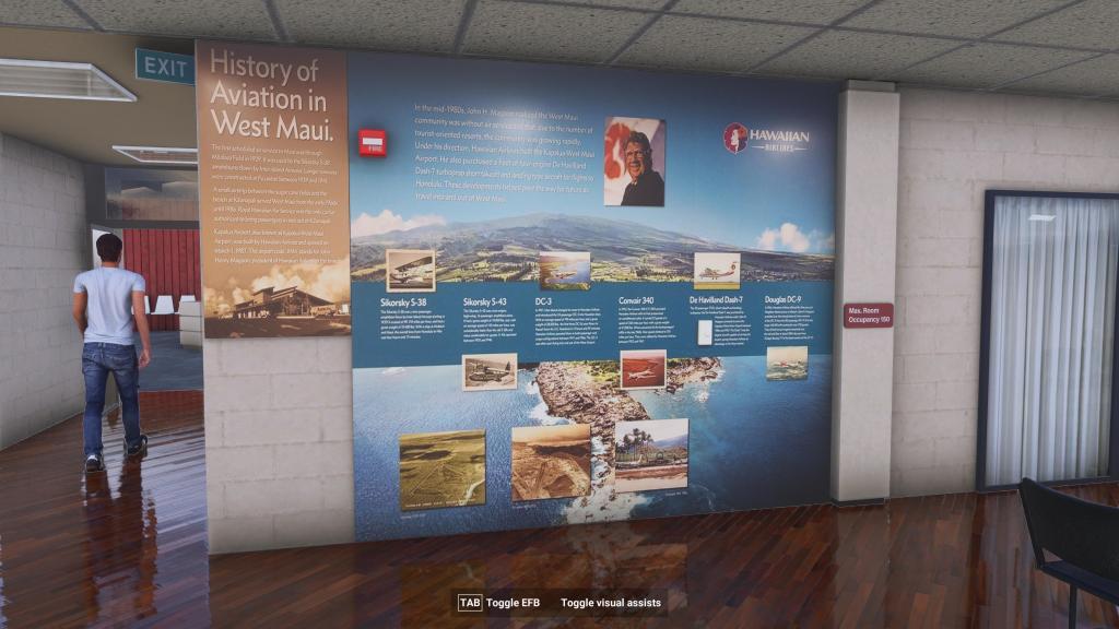 The approach isn’t as scenic as some that I did during this journey but the airport itself is still quite scenic with the ocean views. I also appreciate the terminal details which, when you’re walking around after parking the airplane, can be fully appreciated. I love the floor to ceiling history of aviation in West Maui poster!