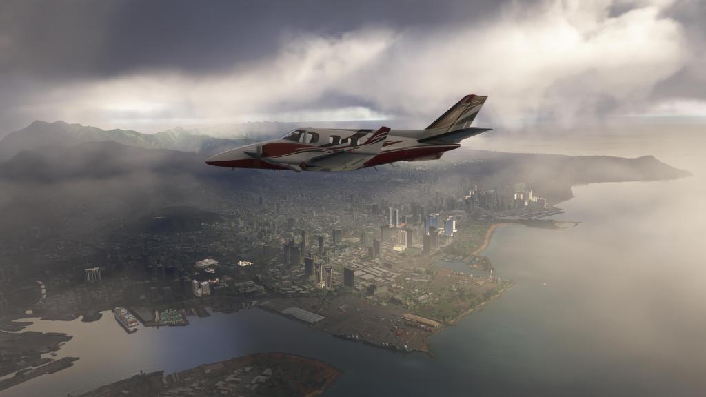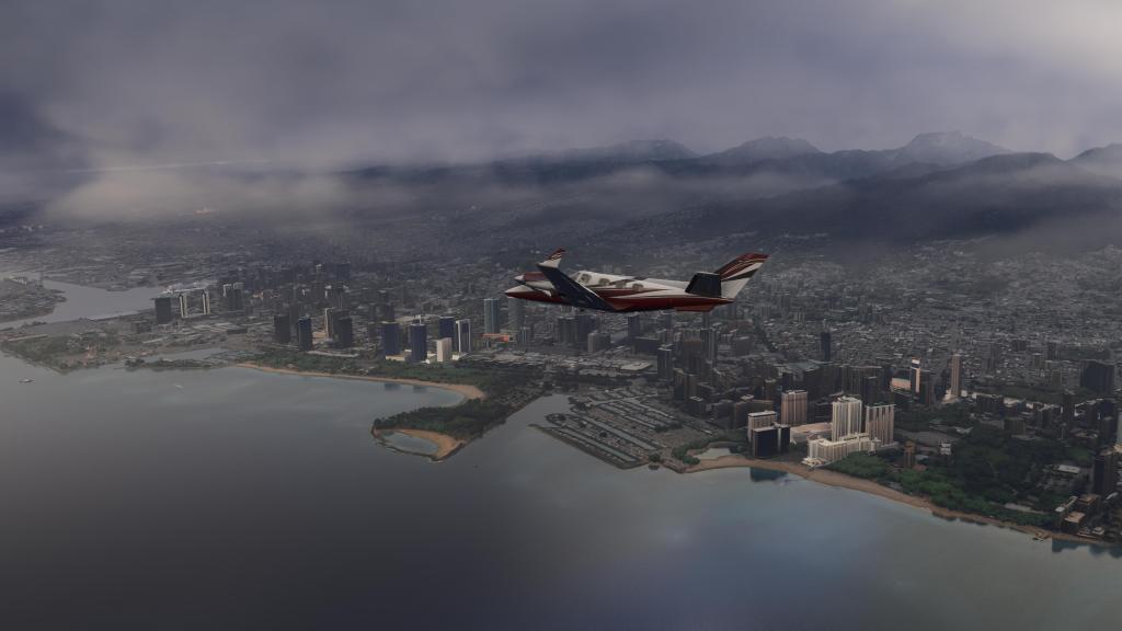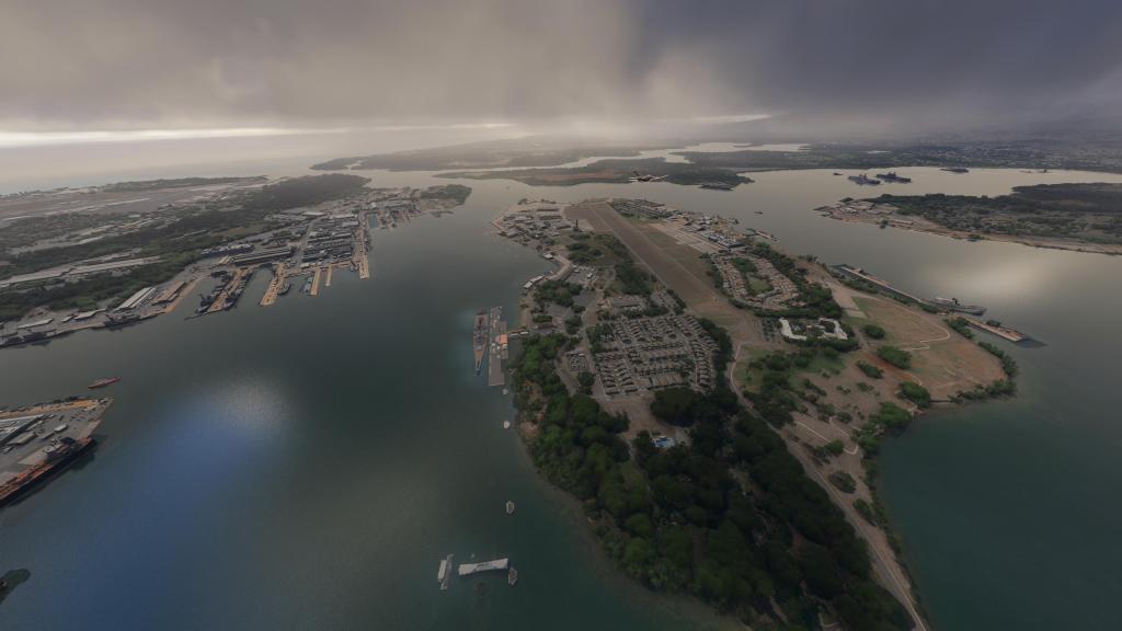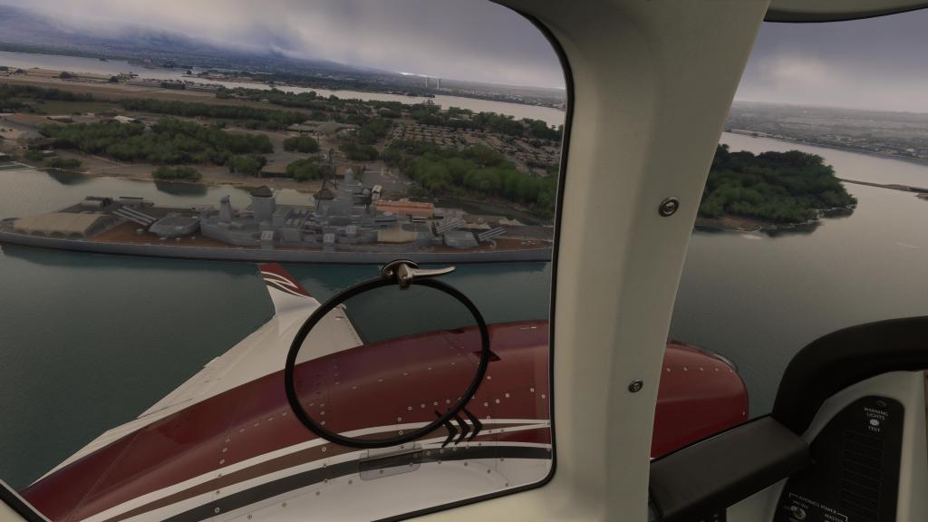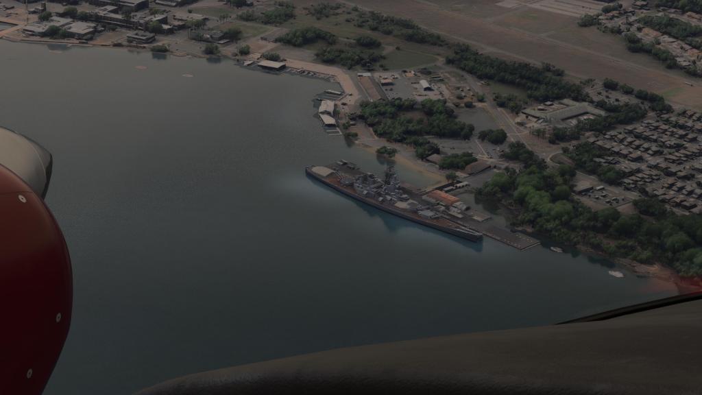 Passing the downtown area, I was obligated to fly over Pearl Harbor and fly over the USS Missouri museum. The battleship is a point of interest in MSFS and looks pretty good as does Ford Island and the surrounding Pearl Harbor facilities. Lots of history here.