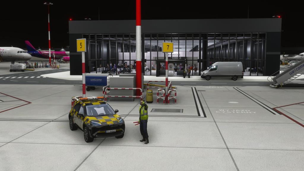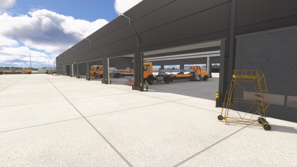 The scenery package includes dynamic lighting, PBR materials, high-definition ground mesh including the runways and taxiways, static aircraft, custom airport buildings, interior airport model, and static aircraft and ground service vehicles.