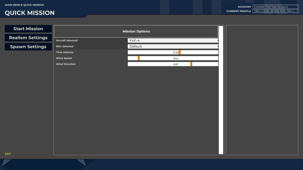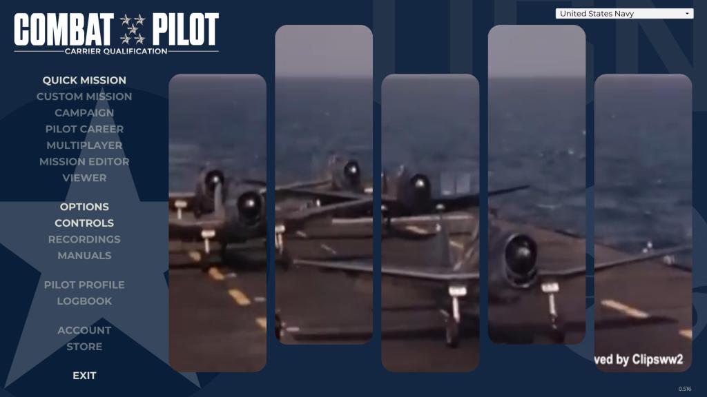 It feels like every time I load up the alpha of Combat Pilot, the UI has changed, and that’s a good thing because the sim is coming together nicely. The main page will greet you with some video clips from the Pacific War and a list of menu items over on the left side. Right now you’ve got Quick Mission, Options, Controls, and Exit but you can clearly see what the ambition is with future mission, campaign, career, multiplayer mission editor and viewers planned.