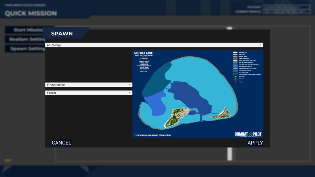 Then we’re off to the meat and potatoes of the experience. Quick mission lets you setup a flight with settings for time of day, wind speed and direction and of course you get to choose your aircraft and your spawn location. You can fly from Midway or directly from the Enterprise or the Akagi and you can choose between the F4F4 and the A6M2.